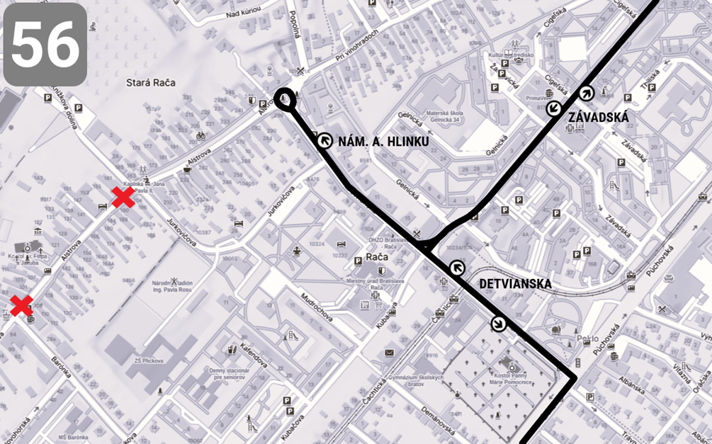 - Linka 56: Bude premávať po obchádzkovej trase cez Rustaveliho a Detviansku so zachádzkou na Nám. A. Hlinku.