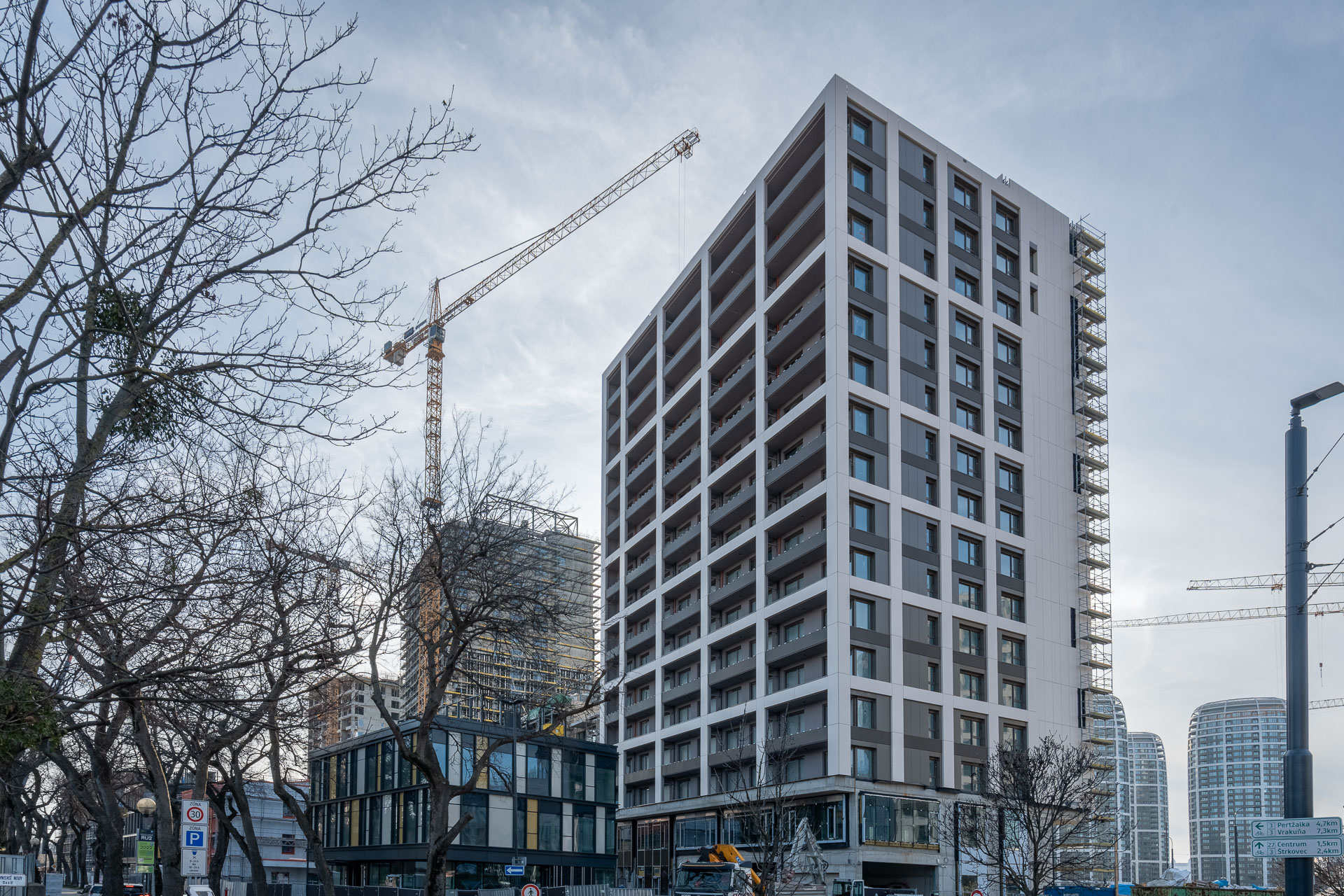 Na všetkých objektoch sa intenzívne pracuje na strechách a obvodových plášťoch. Najpokročilejší stav vykazuje blok A, kde je už jasne čitateľný finálny vzhľad budovy.