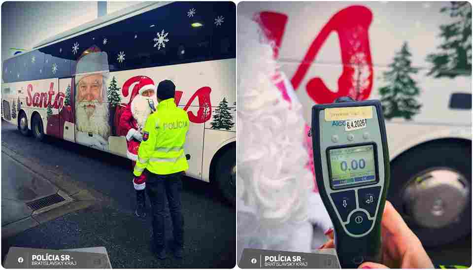 Policajti zastavili Santu. Šofér Santa Busu mal typické ustrojenie a aj príznačný začervenaný nos. Ak by sa zdalo, že ide o dôsledok alkoholu, tak opak je pravdou. Dychová skúška hliadku potešila. (PZSR)