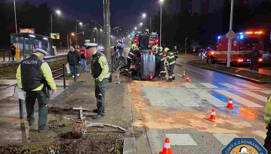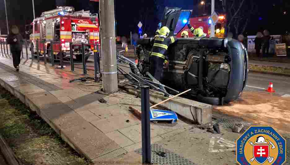 Na Karloveskej prevrátil Fabiu. Vodič vrazil do značky a zábradlia pri priechode pre chodcov. (HaZZ)