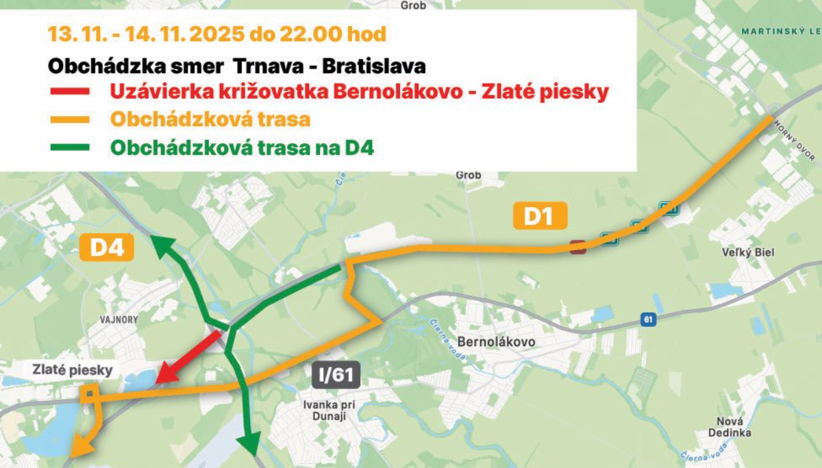 | Od štvrtka (22:00) do piatka (22:00) | Uzavretá časť D1 (smer do BA) | zísť v križovatke Bernolákovo využiť starú Seneckú cestu. Alebo sa napojiť na vetvu D4 v smere na Raču či do Jaroviec. |
