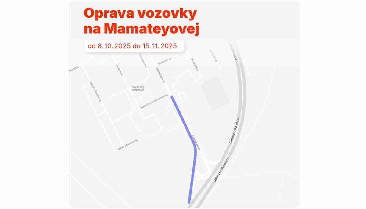 Na Mamateyovej sú obmedzenia. Až do polovice novembra s nimi treba rátať v úseku od hokejovej haly po výjazd na Dolnozemskú cestu. Počas prác bude prejazdný jeden pruh v každom smere a dočasne bude uzavretý vjazd a výjazd na Dolnozemskú. (BT)